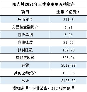 截至去年9月底,阳光城流动资产余额约3149.77亿元,主要是存货及货币资金,其中货币资金217.8亿元,同比下降45.43%,主要因偿还有息负债所致;存货2013.88亿元,同比增加1.23%,变现能力随市场下行而有所下降。该公司并未披露三季度流动资产受限情况。