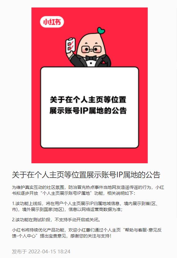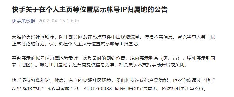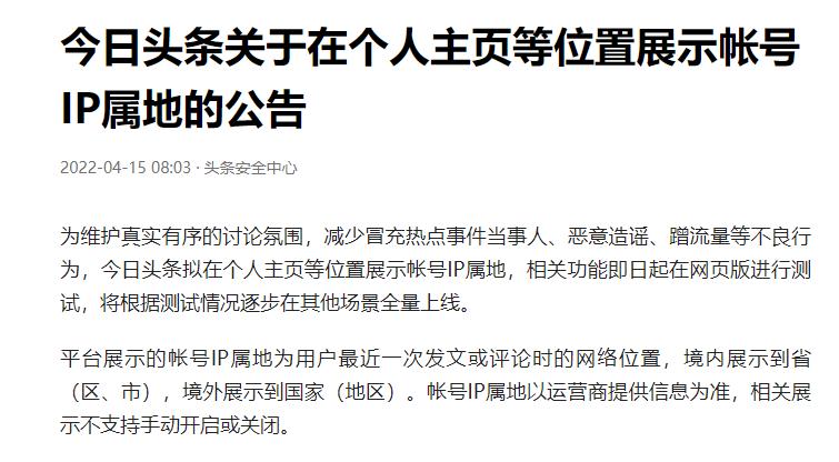 今日头条、抖音、快手、小红书均在公告中提到,为了防止冒充热点事件当事人、蹭流量、传播不实信息等不良行为,拟在个人主页等位置上线展示账号IP属地的功能。该IP属地为用户最近一次发文或评论时的网络位置,境内展示到省(区、市),境外展示到国家(地区),且IP属地展示暂不支持手动开启或关闭。