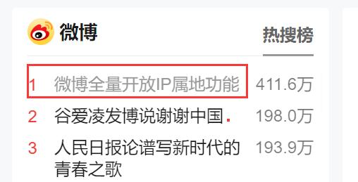 4月28日,#微博全量开放IP属地功能#登上微博热搜第一。