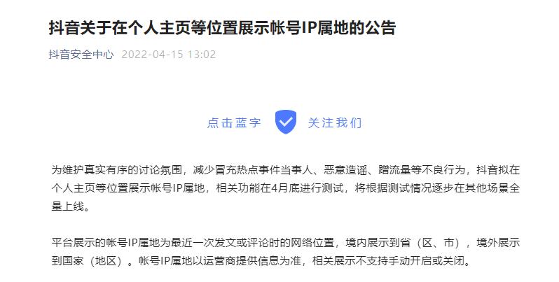抖音、今日头条、快手等平台,将上线显示用户IP属地功能