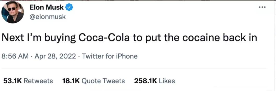 在440亿美元高调收购推特后,今日,马斯克发推文称,“接下来我要收购可口可乐公司,重新把可卡因加进去”。