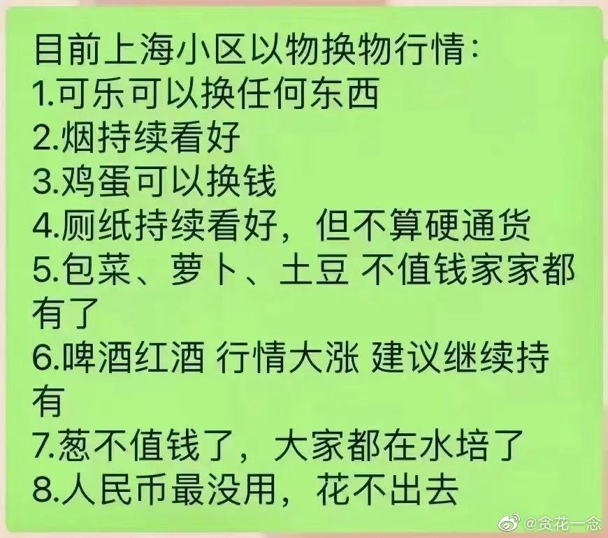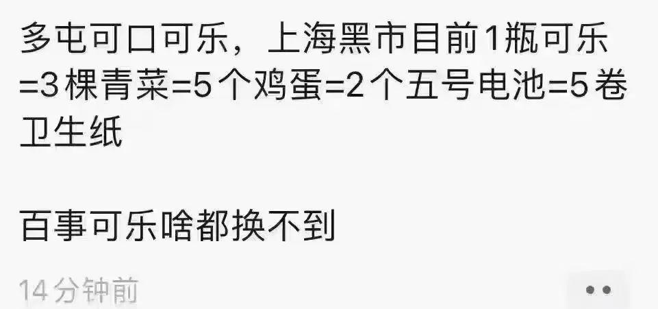 目前,上海的交易法则是这样的,1瓶可口可乐=3棵青菜=5个鸡蛋=2个五号电池=5卷卫生纸。可乐处在“以物易物”的顶端,可以换任何物品。