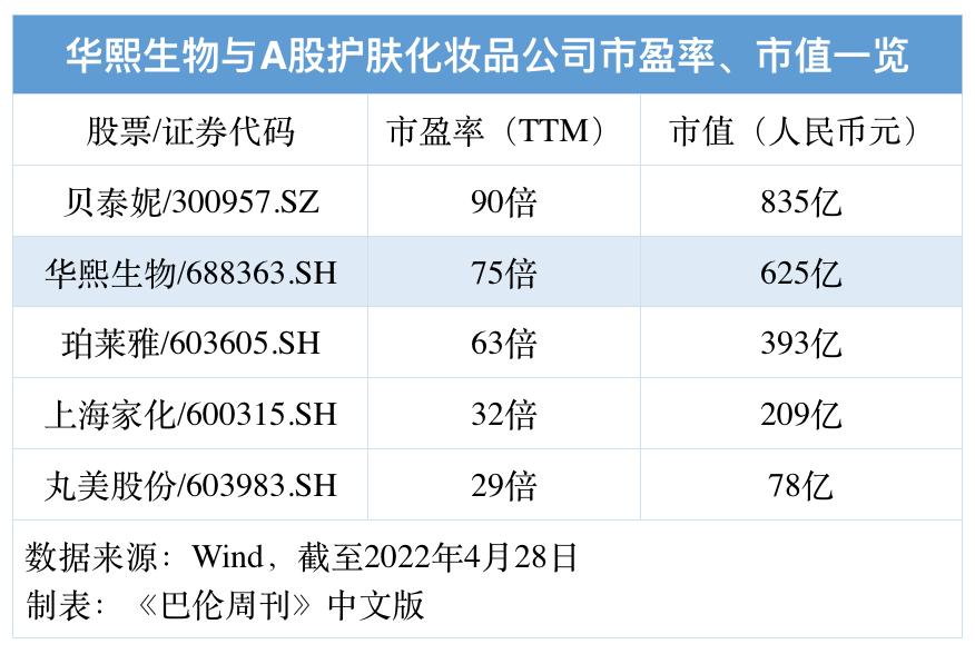 那么,较之A股那些真正意义上的护肤及化妆品公司,华熙生物当前75倍的市盈率(TTM)就显得有些贵,仅低于90倍的贝泰妮。