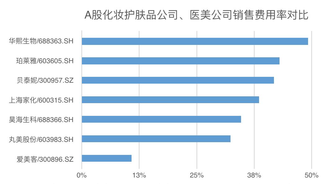 另需强调的是,无论是与护肤化妆品公司相较,还是和其年报中提及的同业公司对比,华熙生物的销售费用占营收比例都是最高的。