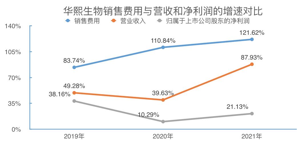 从2018年起,华熙生物的销售费用以大约逐年翻倍的速度递增,并一直把研发费用和整体营收的增速甩在身后。