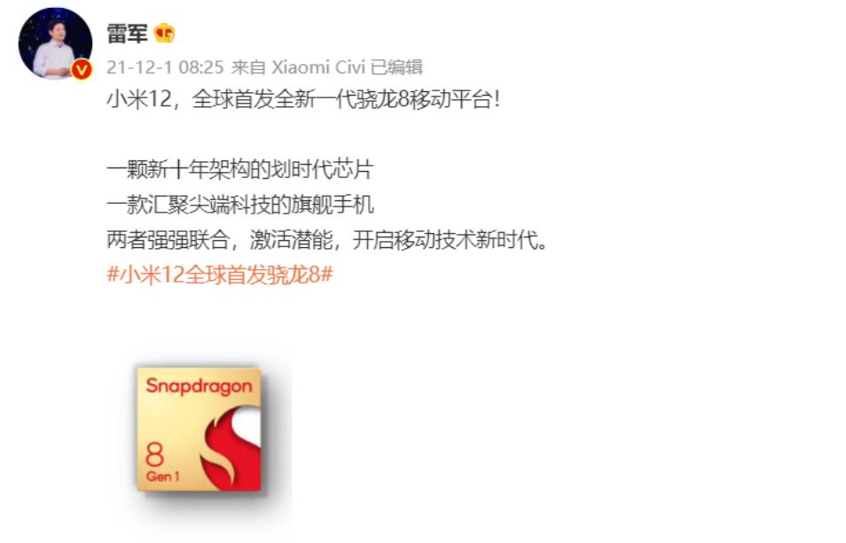 去年骁龙8首发权被联想截胡之后,一直和高通合作无间的小米就收到了一波嘲讽。皆因在高通骁龙8发布前,雷军已在微博预热,明确写道小米12将成为全球首发全新一代骁龙8移动平台,言辞之间兴奋异常。