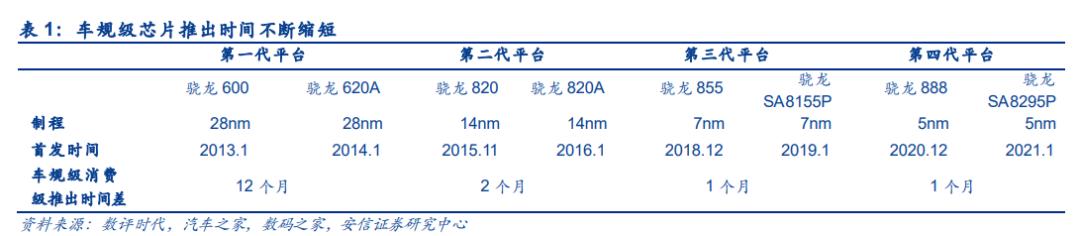 值得一提的是,骁龙888和骁龙SA8295P的推出时间仅相隔一个月,由此可见高通超强的研发实力和同时推进多项业务的能力。安信证券统计的数据显示,从第一代骁龙600到第四代骁龙SA8295,迭代时间一路从12个月缩短至1个月。