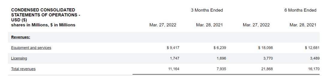 目前,高通的营收主要来自设备和服务业务以及授权业务,前者占比接近九成,是主要营收支柱。Q1,高通设备和服务业务收入94.17亿美元,较去年同期的62.39亿美元增长超30%。