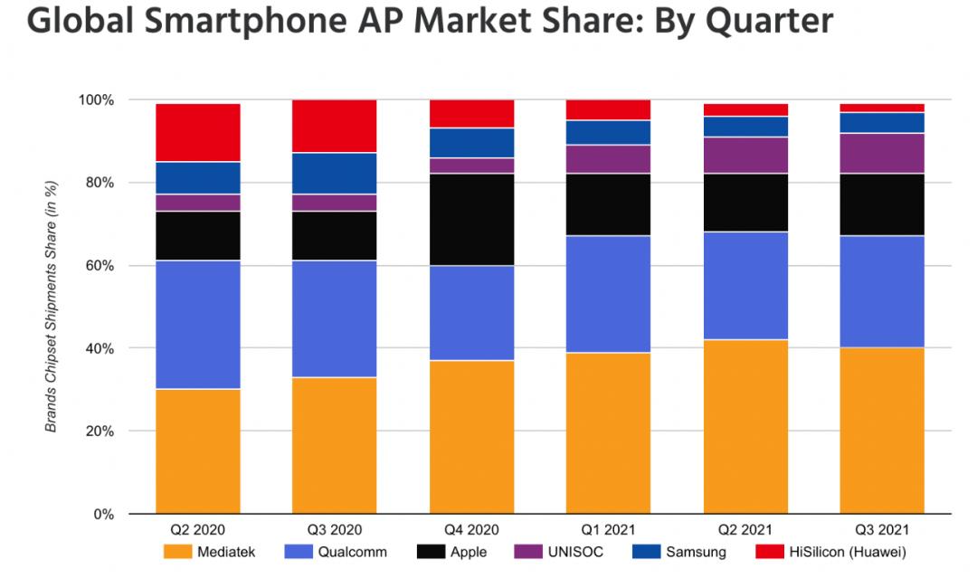 彭博统计的数据显示,华为海思掉队之后,高通在500美元以上中高端旗舰手机市场已经难逢敌手,2021年市占率上升至55%,和三星之间的差距也越拉越大。但承接华为海思市场空缺的,还有联发科——尤其是在中国市场。