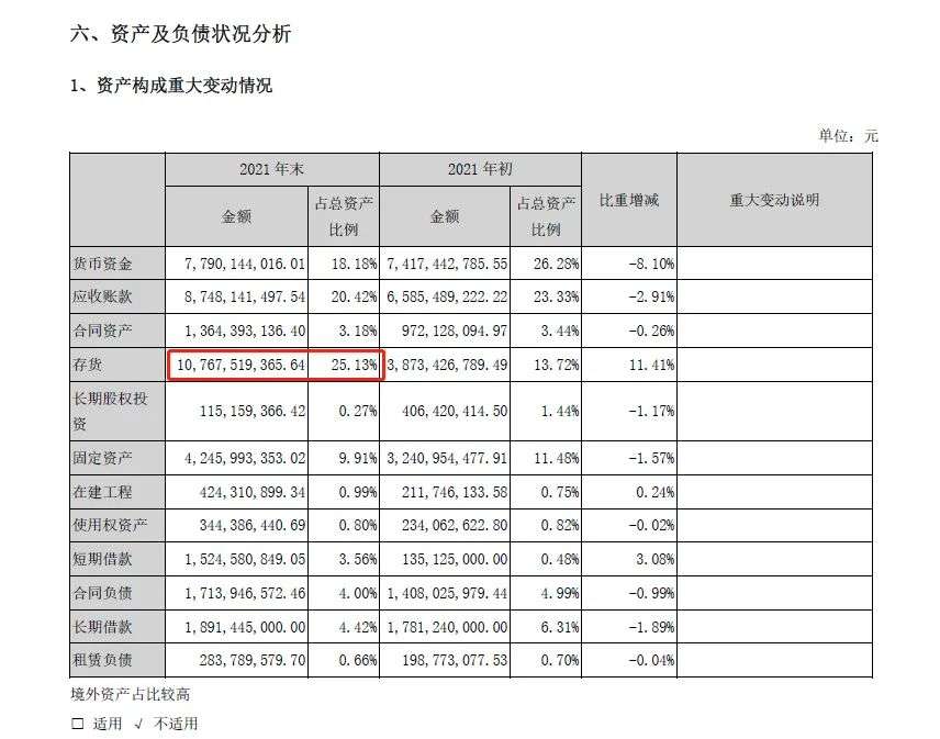2021年年末,阳光电源存货为107.68亿元,占总资产比例为25.13%,而年初占比仅为13.72%。