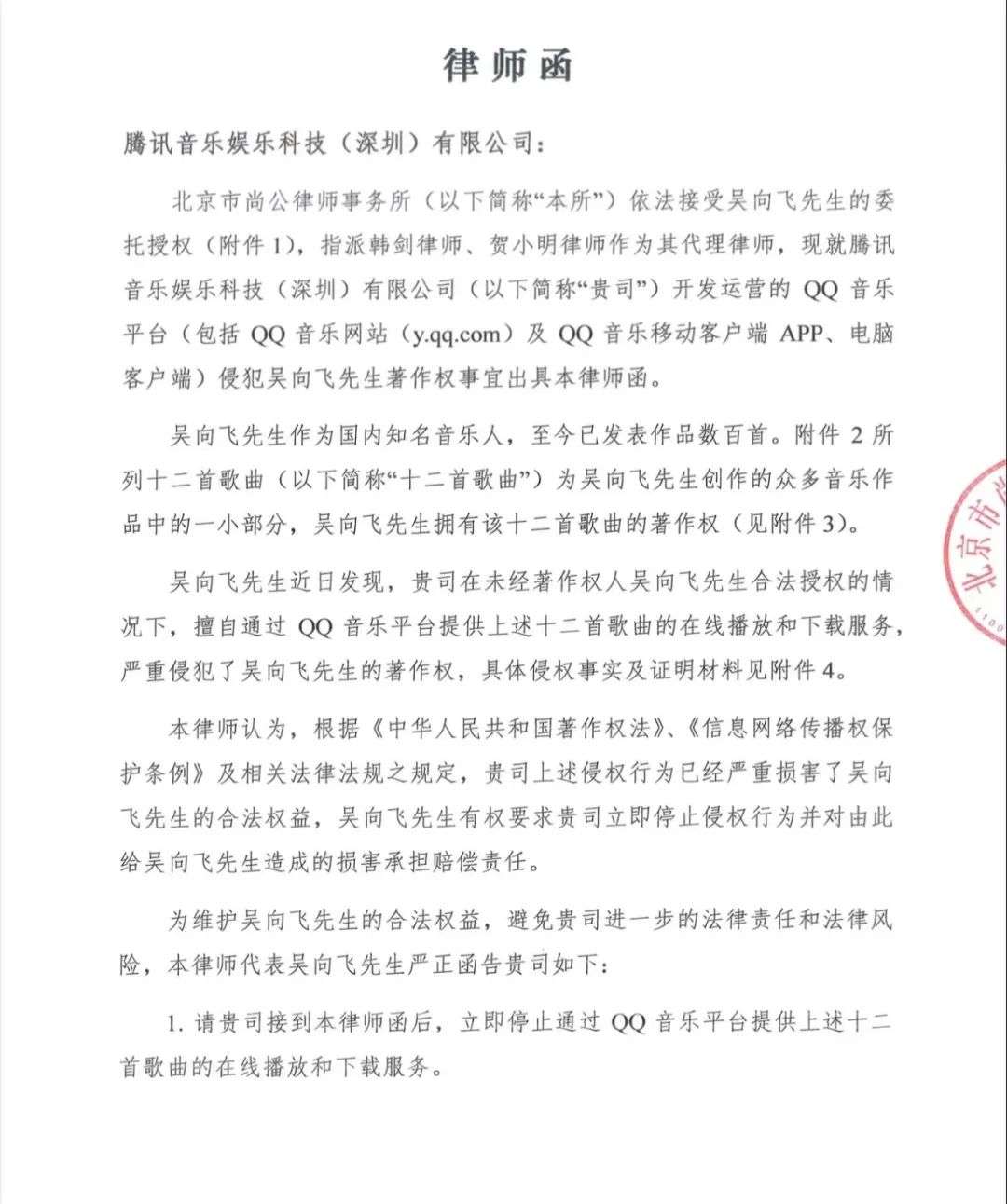 吴向飞告诉《财经·伽玛刀》,2021年6月1日,他的律师函分别送达腾讯音乐和网易云音乐。腾讯音乐很快联系上了吴向飞,并告知后者,环球音乐已通知腾讯音乐,环球音乐与吴向飞的合约到期了,不再代理他的作品。