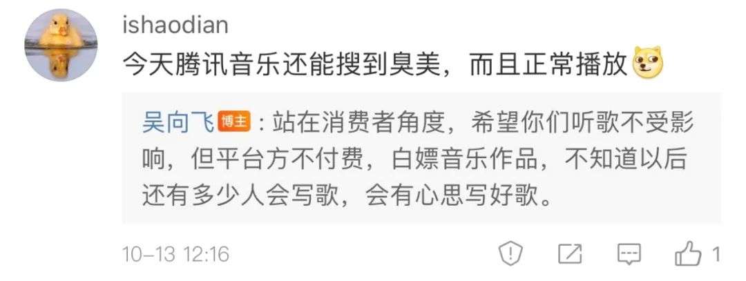 2022年4月2日,在发给吴向飞的邮件中,太合音乐否认从腾讯收到关于这首作品的任何版权费用。《财经·伽玛刀》在QQ音乐搜索发现,这首歌仍然处在上架状态。