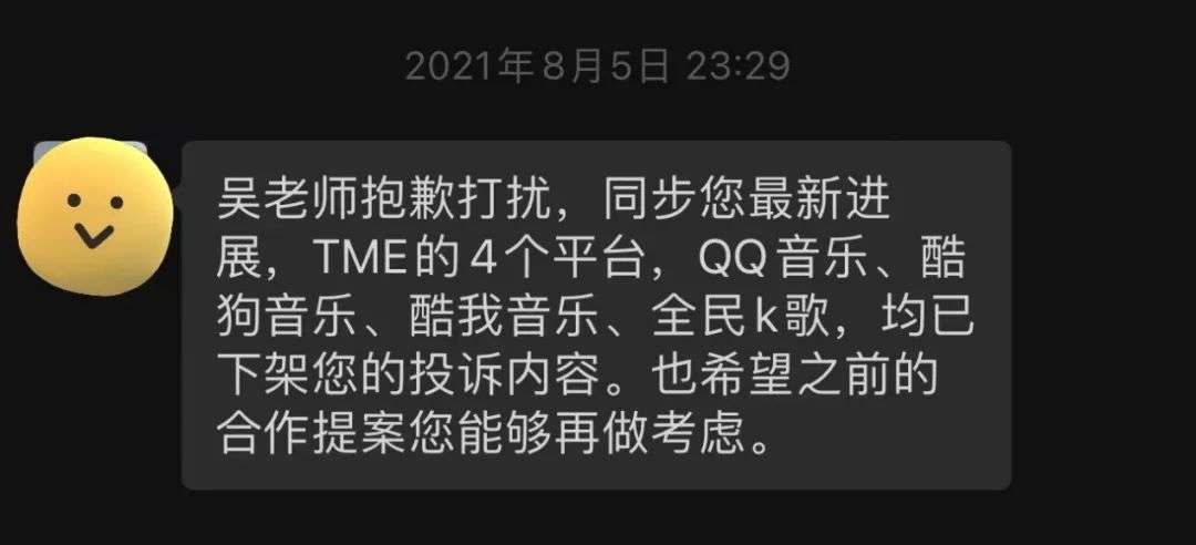据吴向飞所述,双方的沟通持续了很长时间。腾讯音乐的代表还向他透露,腾讯音乐的高层专门开了会商量解决这件事。