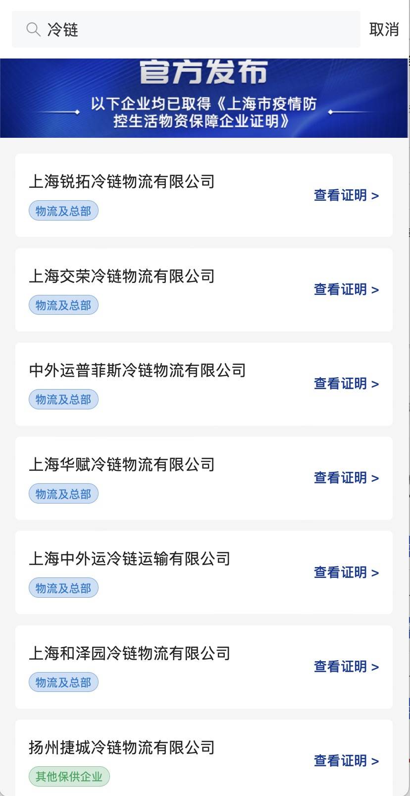 图为上海保供企业名单中的部分冷链物流公司