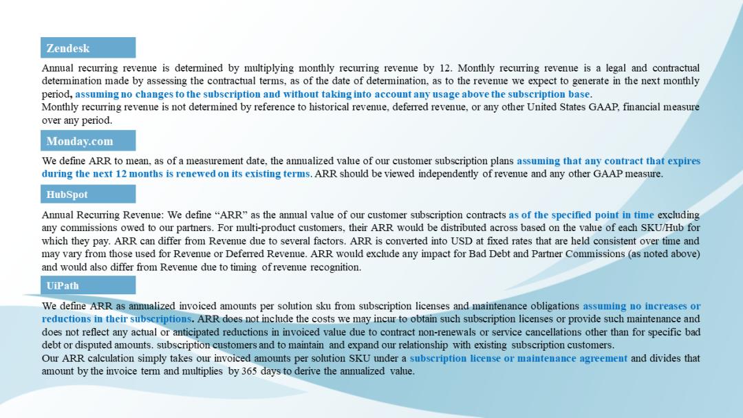 其中,上市企业对ARR大多定义为年度经常性收入,也有定义为年度开票收入。但总的来说,这一指标的目的均为体现某一时点的年化订阅收入规模。需要注意的是,ARR只适用于具备经常性特征的订阅收入。