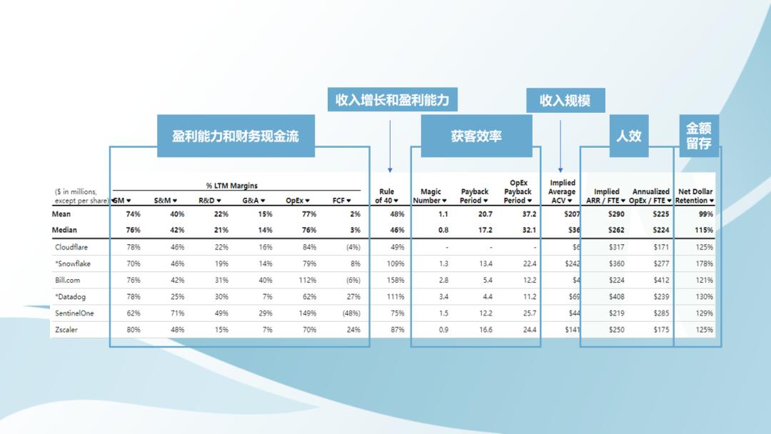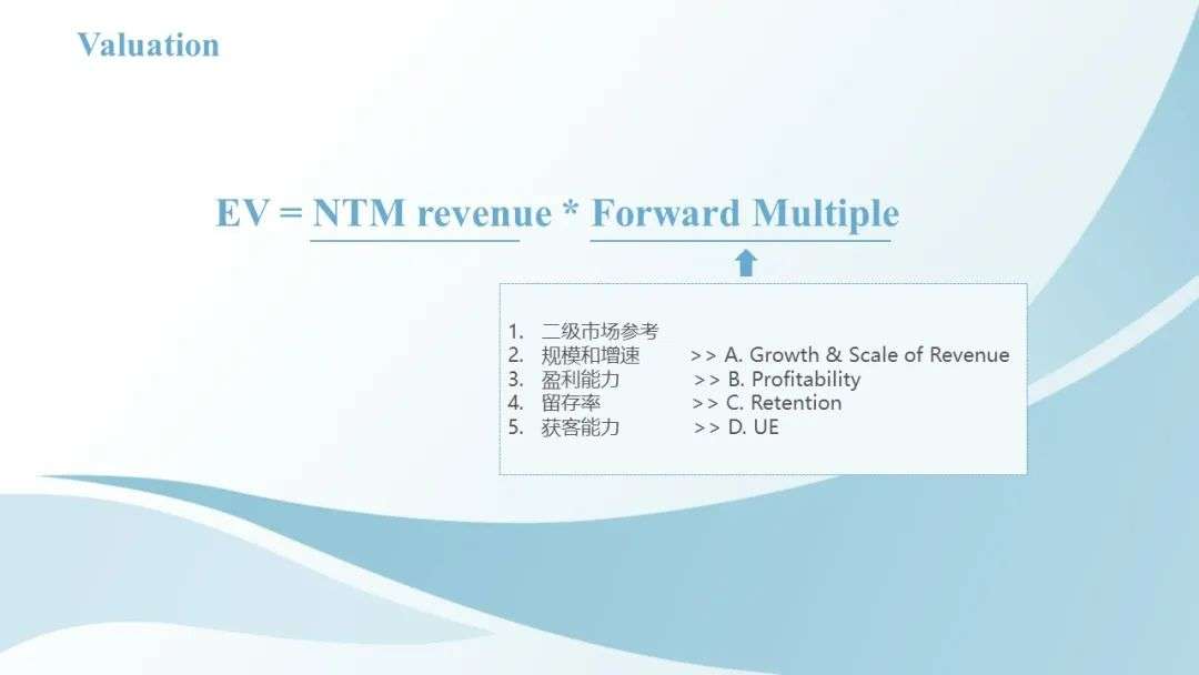 除了对标二级市场估值倍数作为参考,SaaS公司的收入规模和增长率、盈利能力、留存率、获客效率都是调整估值倍数的重要信息。