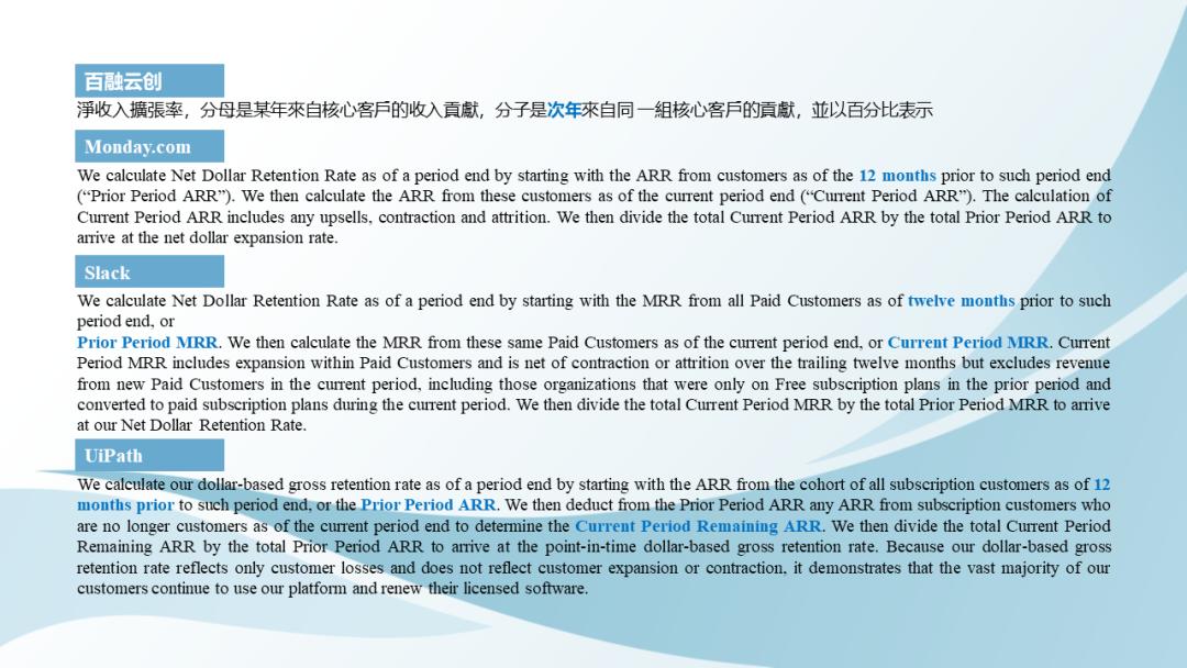 我们也搜集了上市企业对于NDR的定义,内涵基本一致:综合了老客户留存和老客户客单价变动指标,时间跨度是一年,主要体现老客户复购意愿。