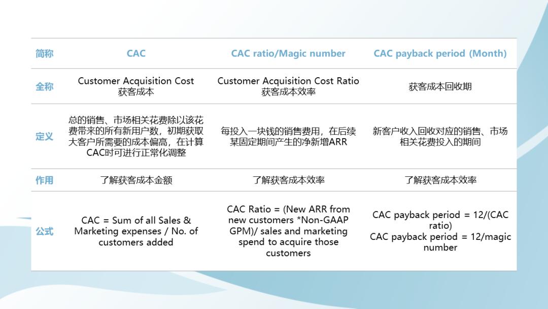 在获客能力指标中,我们需重点关注CAC、CAC ratio/Magic number或CAC payback period (Month),核心是监测销售费用和新客户收入之间的投入产出关系。