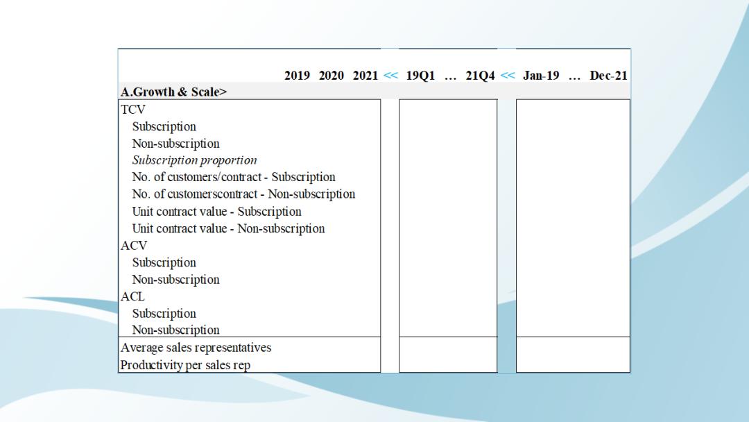 同样,当期新签合同金额TCV也需根据业务分层,以看清增长点、判断可持续性。TCV还需要结合上述FTE中销售人数计算销售人效,并考虑销售有培训期。为防止“空壳合同”,合同的期限和合同转化为收入的确定性需要考察。
