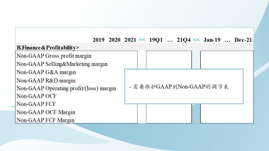 上市公司基本使用Non-GAAP的毛利率、费率和现金流,以更好反映业务情况,并提供两者的调节表。