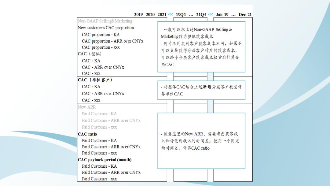一般可以把上述Non-GAAP Selling & Marketing作为整体获客成本。在实际操作中,不同级别的客户需要的获客投入不同,给不同级别的客户分层设置不同权重(上图proportion),可以把整体获客成本分摊到分层的客户;再结合各层新增客户数量,来计算分层客户的CAC。