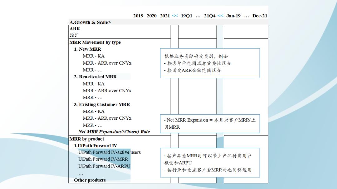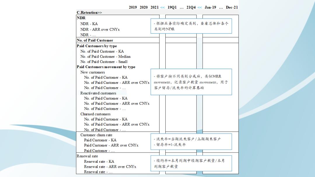 其中,在客户分层时可以按照大客户(上图KA)和小客户来分,也可以按照ARR区间根据业务实际分(上图ARR over CNYx)。总的来说,分类要符合业务实际及统计期内保持口径可比。