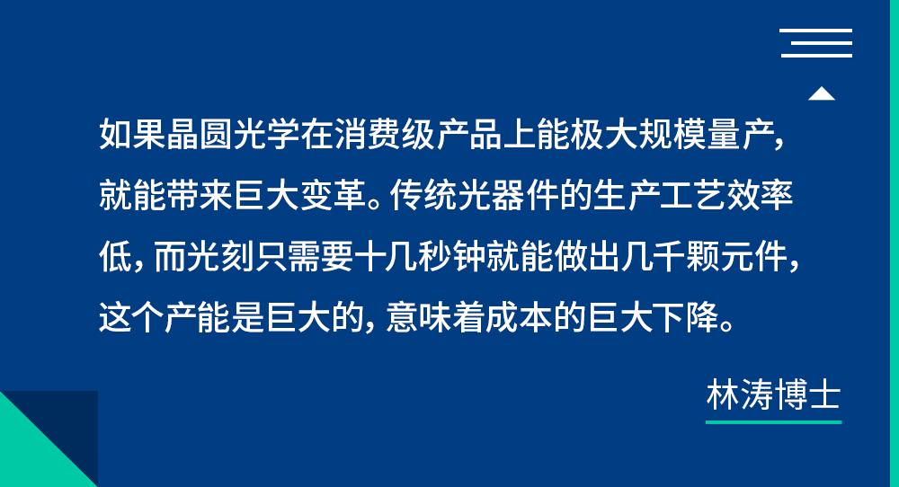 林涛:如果晶圆光学在消费级产品上能极大规模量产,会带来巨大变革。从行业来说,传统光器件的生产工艺效率低,而光刻只需要十几秒钟就能做出几千颗元件,这个产能是巨大的,意味着成本的巨大下降。