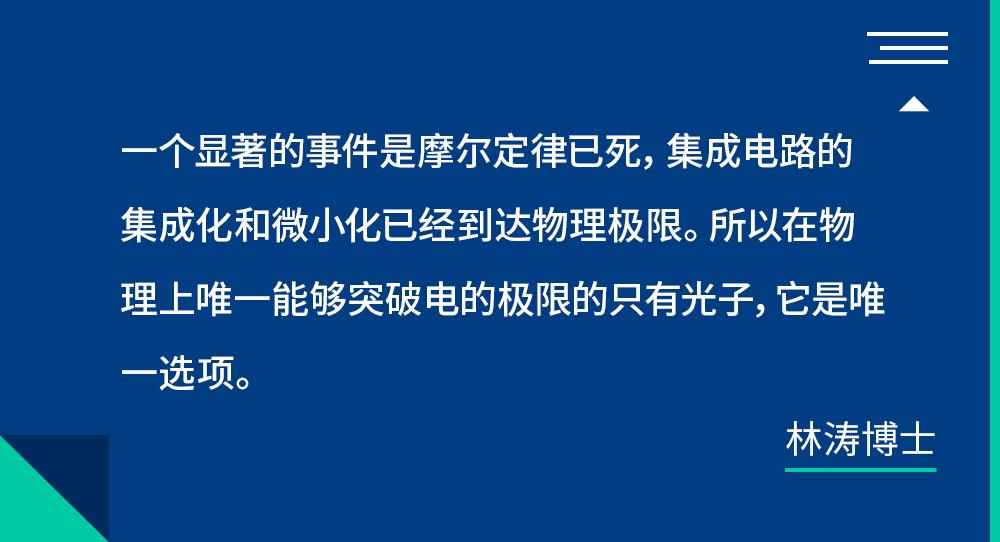 但是宏观上一个显著事件是摩尔定律已死,因为集成电路的集成化和微小化已经到达一个物理极限了,当然也可以做得更小,但从经济上来说边际成本和效益不成正比。所以,在物理上唯一能够突破电的极限的只有光子,它是唯一选项。