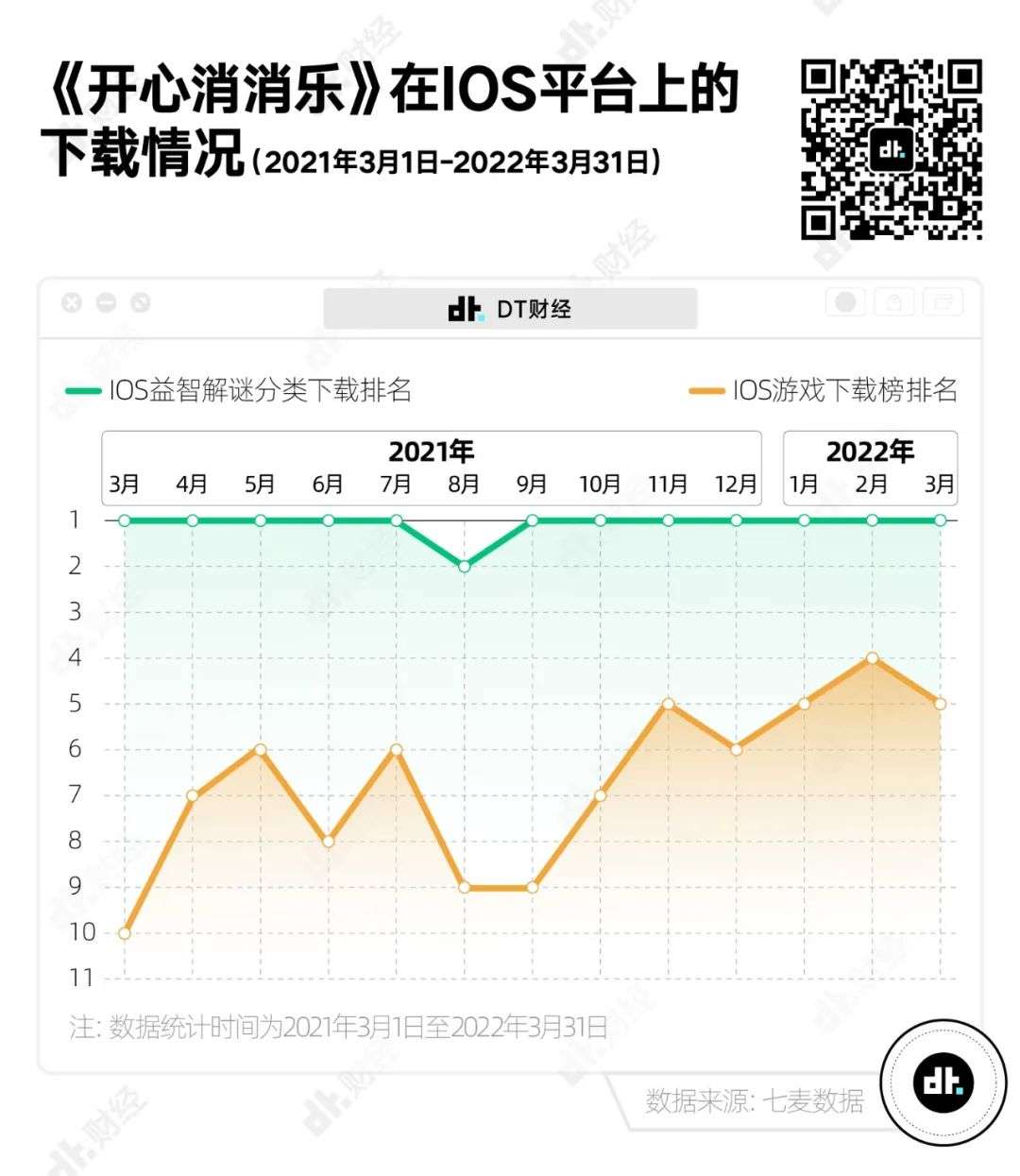 凭借着移动端的方便快捷以及游戏自身的创新玩法,《开心消消乐》在发行后迅速占领同类游戏市场,直到今日仍然畅销不衰。在最近一年的IOS游戏下载总榜中,《开心消消乐》始终位于总下载榜的前十行列。自2022年1月以来,这款游戏的下载量也一直保持在下载总榜的前5名。