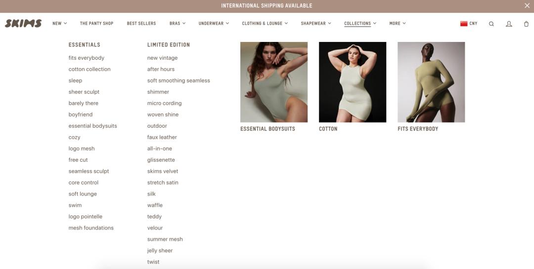 skims,主营产品包括内衣、连体衣、塑身衣、外套、裤装、连衣裙、配饰等。