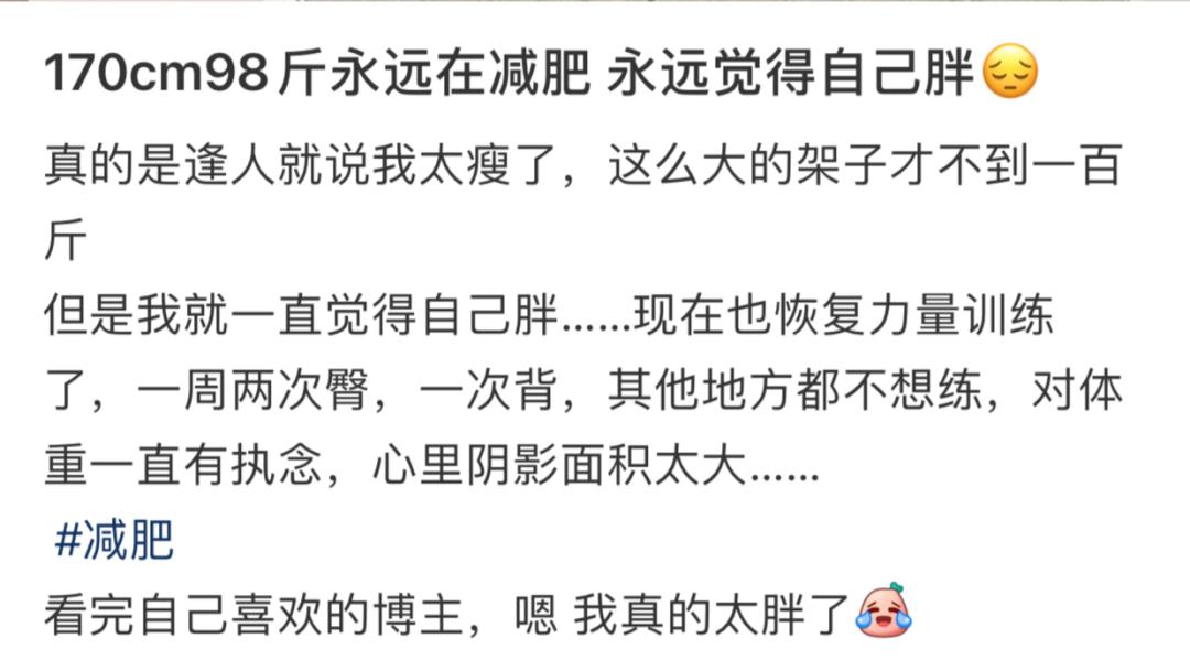 在热门帖子中,不乏一些身材姣好却依然觉得自己胖、永远在减肥/健身的女生,让普通身材的女孩们更加无地自容。