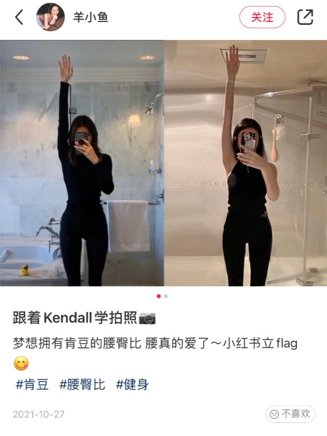 “跟着Kendall学拍照”一度成为女孩们的拍照模版,主要凸显的是女孩们的细腰、翘臀,以及健身曲线。