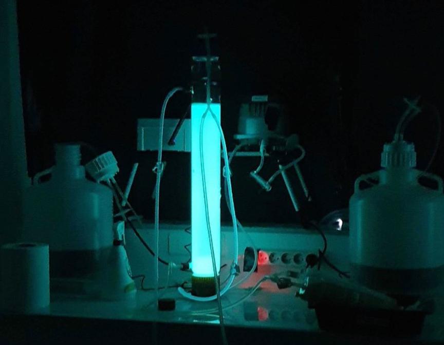 Glowee从法国海岸收集费氏弧菌后,把它们存储在充满盐水的试管中,然后再转移到类似“水族箱”的容器中进行培养。