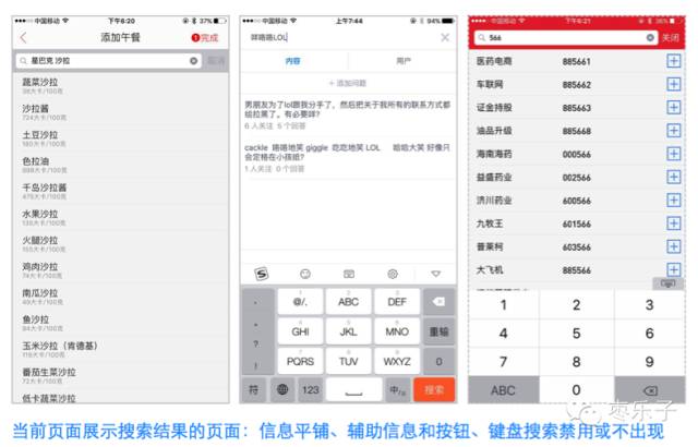 1、在当前页面展示搜索结果的页面,内容较简单,主要目的是为了让用户进一步点击选择,使得搜索的结果可控。这种情况下常以列表形式平铺地展现信息,相关地二级标题或按钮会结合搜索结果同步露出。这种情况下,很多时候键盘地“搜索”按钮是禁用的或者键盘的设计无搜索按钮。(见图6)