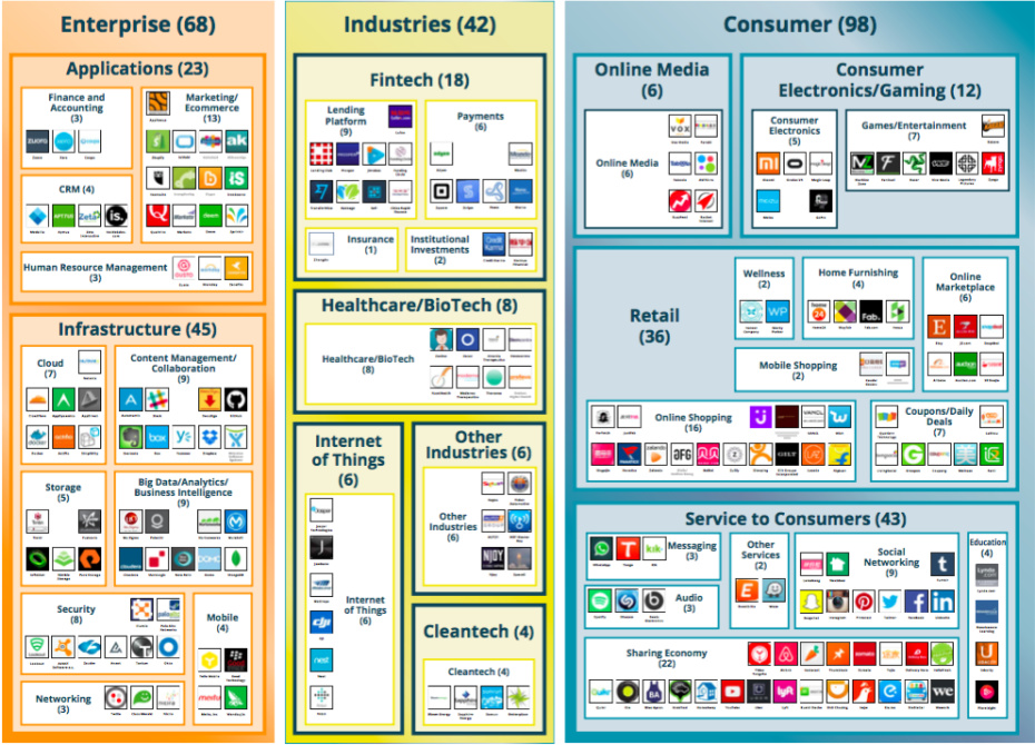 Spoke Intelligence和VB Profile今日发布了一份有关“独角兽”公司的研究报告,报告显示,目前全球有229个独角兽(估值超过10亿美元的公司),其中有21家公司的估值超过100亿美元。其中有98家独角兽是在消费者消费类领域,尤其是在零售和共享经济市场。零售领域的独角兽包括阿里巴巴、在线艺术品电商Etsy。共享经济市场上的知名独角兽有Airbnb和Lyft等。而在企业技术基础设施或相关垂直领域的独角兽有112家,这些公司覆盖的行业包括金融科技、医疗科技、清洁科技和物联网领域。