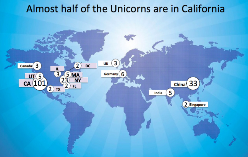 全球独角兽数据:共229家独角兽,近一半在加州,中国33家