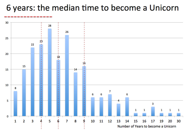 Cases表示,创立独角兽是需要花一定的时间的,平均需要花6年时间才能成长为独角兽。而投资要想从中退出,则需要花更长的时间,有75%的独角兽还没有完成投资退出。已经完成投资退出的52家公司里,大约有一半公司被收购,一半公司上市。