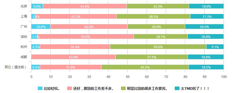 广州地区有十分之一的产品经理认为自己的工作比较轻松,反倒是生活相对安逸的成都,却没有产品经理认为这个职位比较轻松。