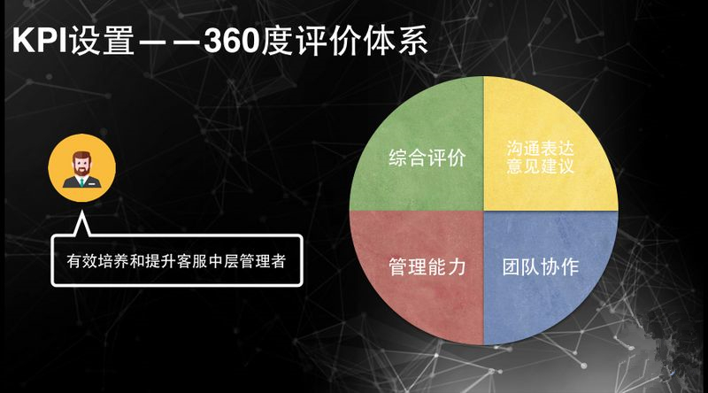 360 度评价体系是我在世纪佳缘的时候建立起来的。评价标准包括综合评价、管理能力、团队协作以及沟通表现和意见建议等几个角度,以有效提升客服中层管理者的水平。对于中层管理者同级员工,同级组长给你评价,下级小组成员给你评价,上级领导给你评价,外面协作部门给你评价。通过综合打分,更能发现问题。
