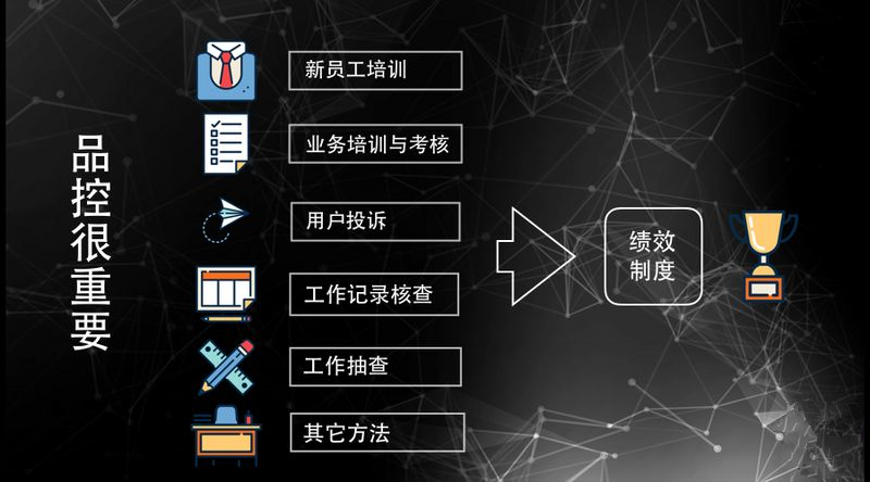 客服是公司形象在用户心中的传递者和塑造者,工作质量的控制格外重要。品控主要靠绩效制度来保证。