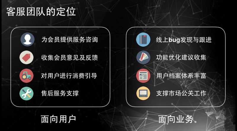 对外:他们面向用户——为用户提供服务咨询、收集用户意见和反馈(以优化产品)、对用户进行售前消费引导和售后服务支撑。