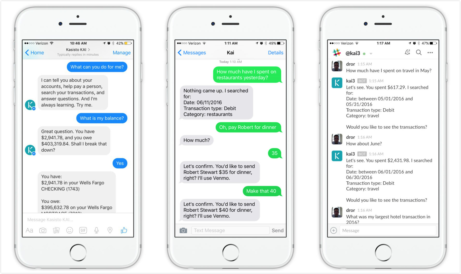 MyKai是创业公司Kasisto的孵化项目,这家创业公司来自于曾经孵化出Siri的硅谷研究实验室。和当下主流的语音交互软件Facebook Messenger及Slack的功能一样,MyKai切入的是银行领域的语音交互,为用户查看账单、甚至银行转账等提供一种更便捷的方式。用户语音提出要求指令,聊天机器人可以为用户提供最近的账户余额信息,或者最新的付款信息和网上转账信息。