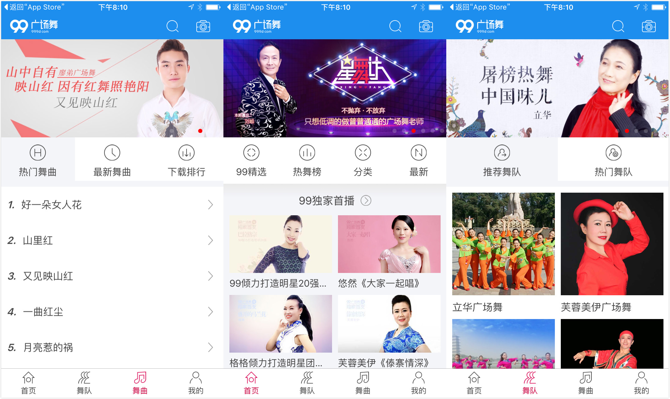并且由于舞曲的时常更新,学习既有难度也有成就感,通常大妈们1-2周就要学一支新舞。因此对她们而言,最大的诉求是看视频学舞蹈。鉴于此,“99广场舞”选择从视频内容切入,通过聚合领域内的意见领袖,包括美久、格格、廖弟、饶子龙等明星老师、舞队和知名舞蹈组织,来为广场舞阿姨们提供专业化的教学视频。