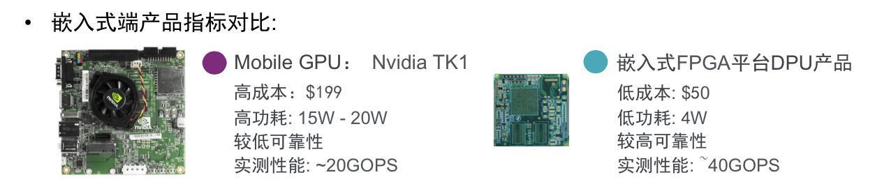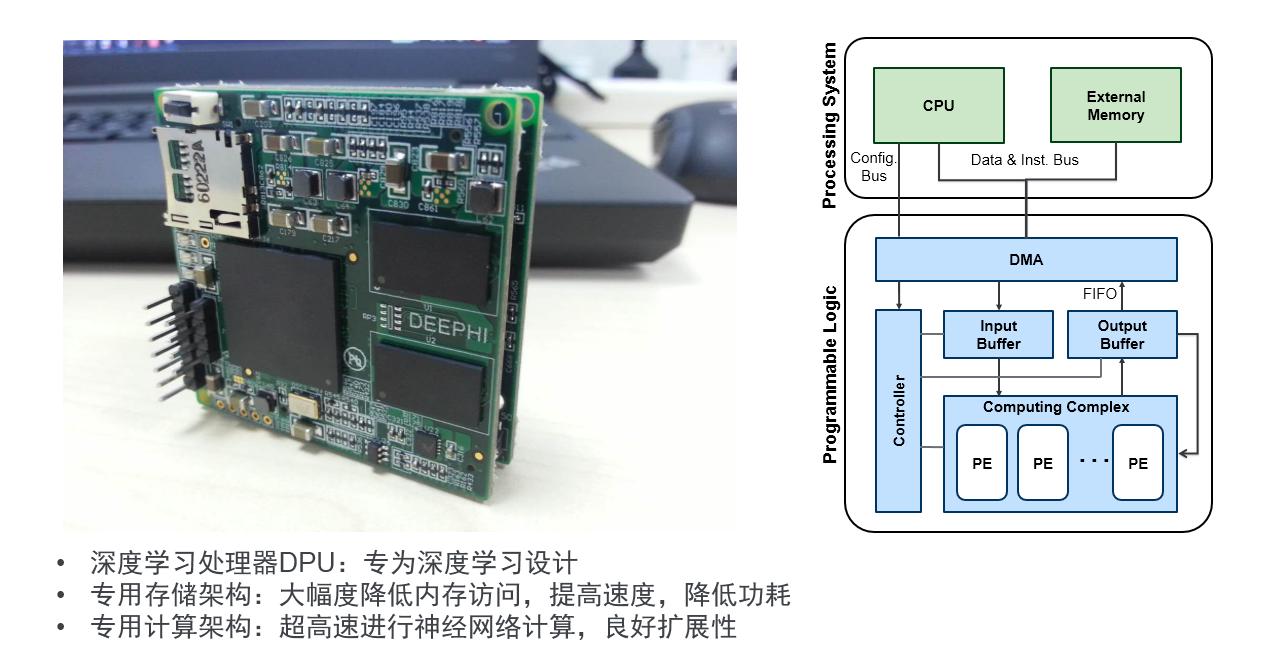 早在2016年1月,深鉴科技就已经设计出一套基于DPU的一整套深度学习硬件解决方案,包括DPU的芯片架构、DPU编译器、硬件模块(订制的PCB板)三部分。直接呈现的产品就是硬件模块,共有嵌入式端和服务器端两款,在性能超过同类产品的同时,功耗、售价都大幅下降。