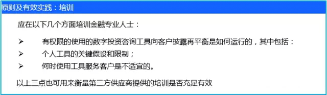 大多数企业需要金融专业人士在被允许使用数字投资咨询工具之前参加培训项目。培训有针对特定工具的培训,也有嵌入到公司标准的适宜性训练。此外,在金融专业需求发生时,一些企业还安排特定培训。