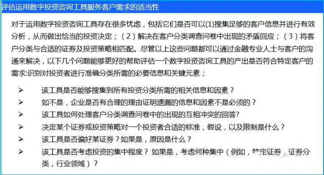 公司应询问客户适当问题以判断客户的投资需求是否能仅依靠数字投资咨询工具来满足。例如,一个简单的数字工具也许不能够满足客户综合打理多个投资账户和多个投资目标的需求。在这种情况下,作为建议流程的一部分,该客户可能被推荐给其他金融专业人士。