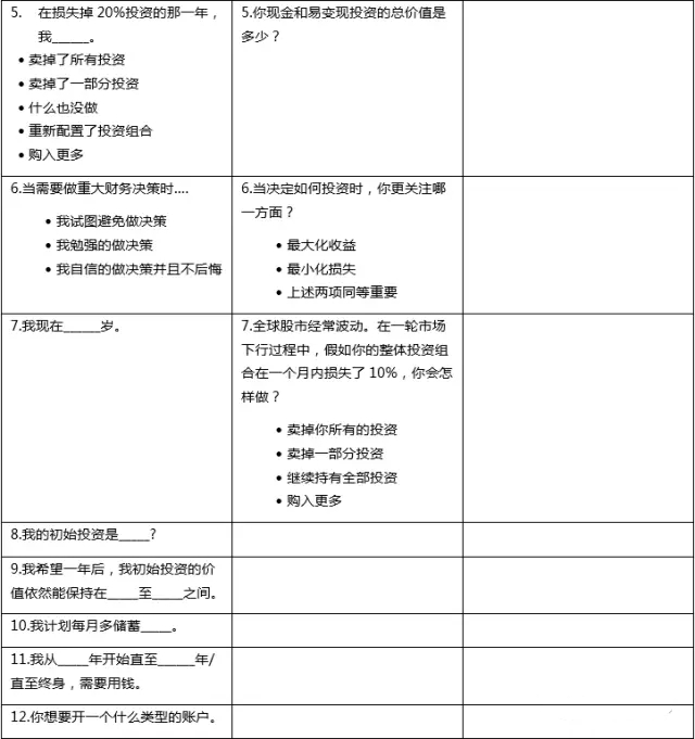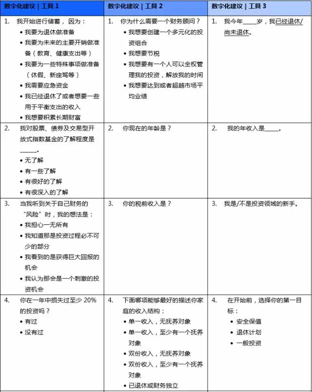 三个面对客户的数字投资顾问关于客户分类问卷的对比: