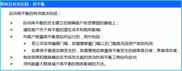 再平衡的触发点在以上提到的面向客户的投资咨询工具中各不相同。一家公司使用了3%的投资组合偏离门槛来启动再平衡。投资组合的偏离每天都会被监测。相比之下,另一家公司的投资管理委员会决定根据市场活动的变动采取临时的再平衡方案。同样,其他两家公司监控客户的投资组合,并按照客户需求的变化不定期的重新平衡投资组合,但没有说明具体的偏离参数。
