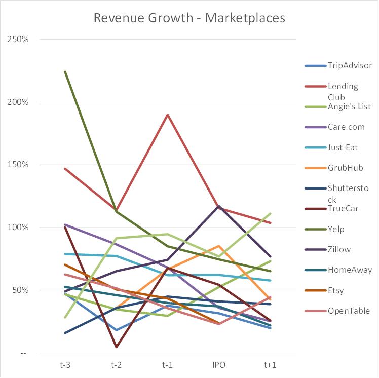 据图所示,市场领域 IPO 之前收入增长较快的公司是Lending Club 和 Yelp。 Trulia 和 Zillow的的收入增长也接近100%,在 IPO 之后加速增长。毫无疑问,这两个是该行业内 IPO 表现最好的公司。其他的市场类公司的年收入增长在 30-80% 的范围内,相对平稳。