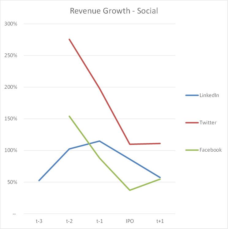 不用震惊, Facebook、LinkedIn 和 Twitter 在IPO之前的1-2年内年收入增长都高达100-200%,在IPO之后也在不断增长。